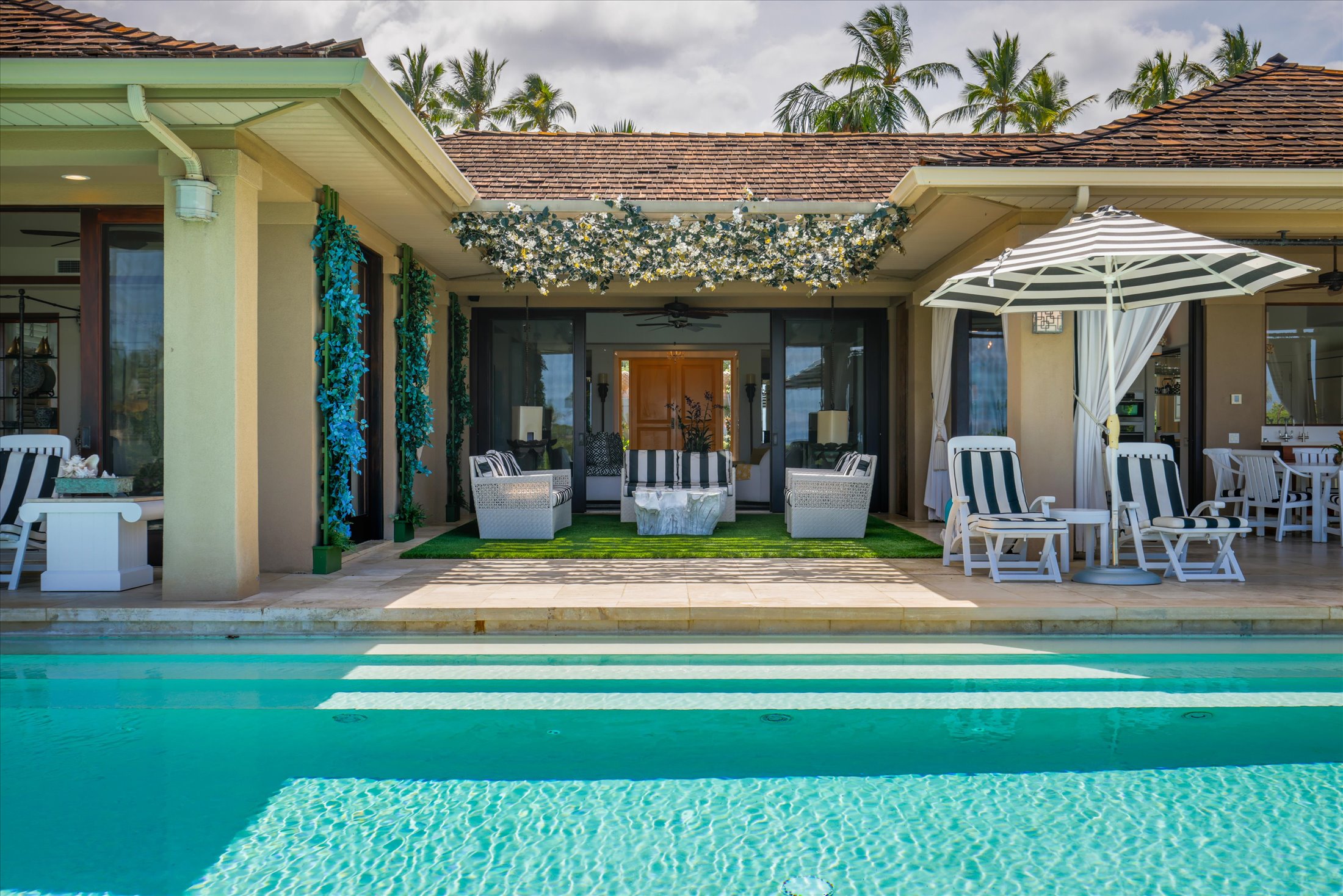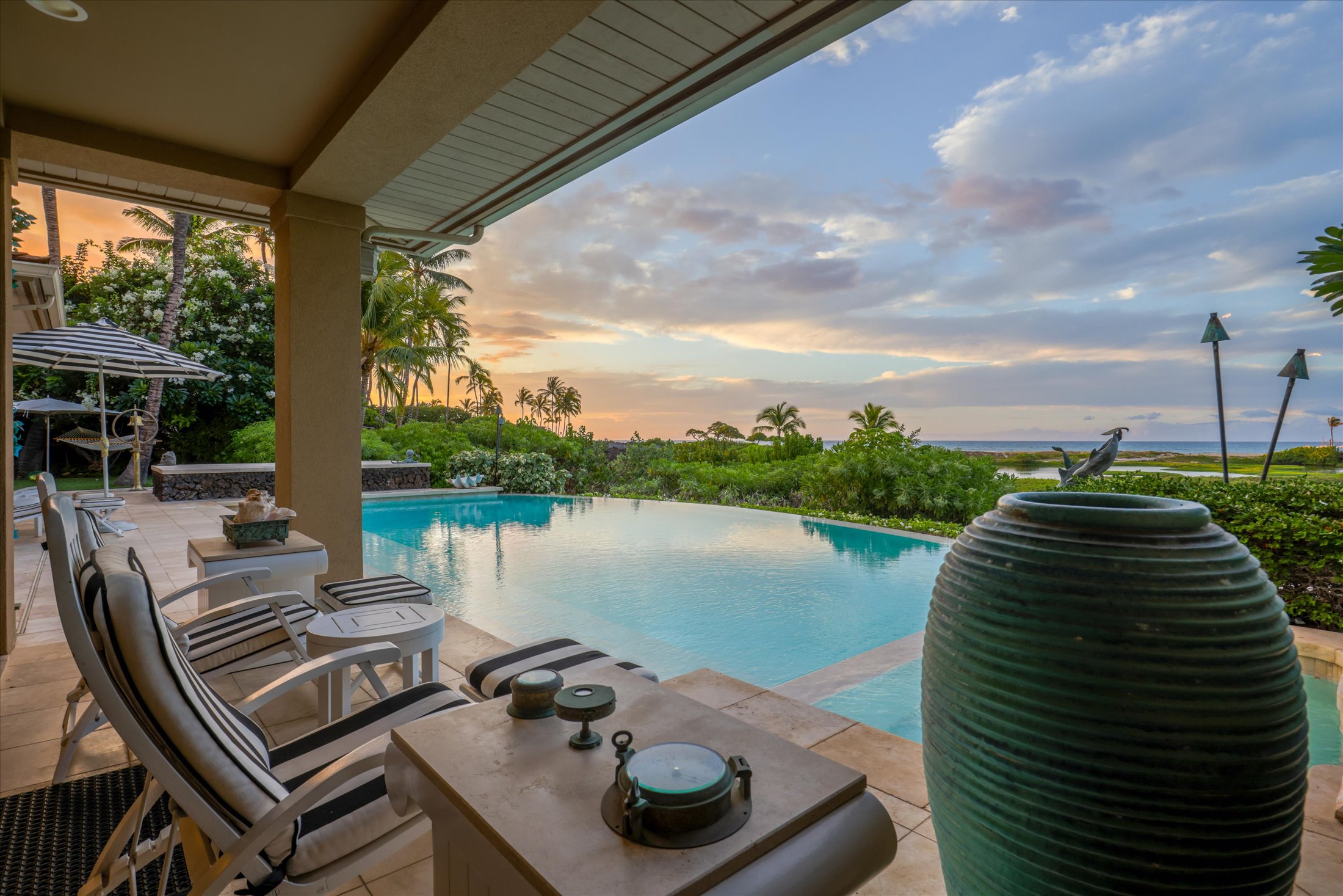 Treat yourself to the best location on the resort with white-water ocean views from this designer appointed 3-bedroom custom home. The beach, restaurants and all of the services and amenities that the Four Seasons Resort has to offer are a just a short stroll away from this luxurious home. Overlooking the sandy beachfront and the 18th tee box of the Hualālai Golf Course, guests of this estate property will enjoy 3,200 square feet of interior space and 1000 square feet of covered lanai space.